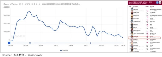 如下图,一个月后《幻塔》海内外热度和收入同步迅速下降,10月下降到了21名。