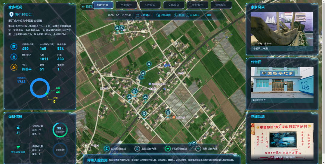除了查看乡村基本情况、反映村容村貌、提升乡村数字化治理效能,5G数字乡村智慧大屏还囊括了乡村综治、产业振兴、人才振兴、文化振兴等多个板块,具备电子地图、智慧党建、异常告警等多个功能,充分体现了长街港中村的文化产业特色。