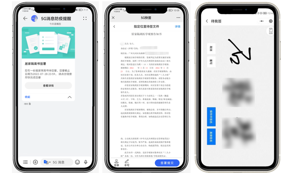 根据政府防控相关规定,针对密接者等特殊人群需下发居家隔离医学观察告知书。如何在减少接触风险的情况下完成文件签署?有了5G快签电子签名平台,防疫工作人员可线上向目标人员发起《居家隔离医学观察告知书》等电子文件签署提醒。收到短信的居民完成个人身份核验后,即可使用电子签名完成具备法律效力的文件签署,既提升疫情防控效率,还有效降低人员接触感染风险。截至目前,已在广州超30个社区落地使用。