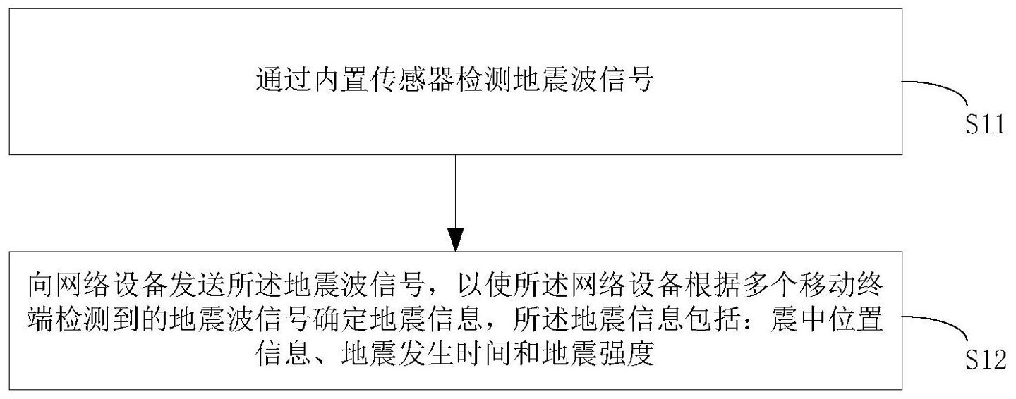 本公开中,利用移动终端中传感器监测成本低、使用灵活的特点,使用公众的移动终端即可建立覆盖范围广泛的监测网络,并且利用电波比地震波快的特点,在破坏性地震波到达之前发出通知预警,减少灾害损失。