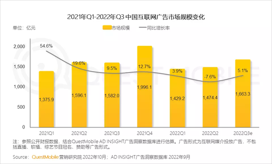 据QuestMobile《2022中国移动互联网秋季大报告》估算,Q3互联网广告市场规模为1663.3亿元,同比增长5.1%,开始从前两季的低谷走出。