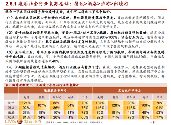 据招商证券最新发布的研报分析,综合各经济体防疫放松后的经济发展情形来看,东亚各国/地区开放较晚,整体恢复落后于英美;行业复苏节奏上,餐饮最快,其次是酒店,航空和旅游业最缓慢。