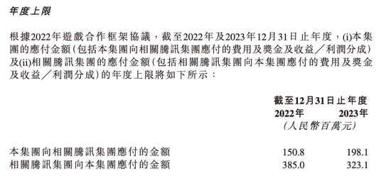 腾讯与快手签订有游戏合作框架,约定进行游戏营销及推广等方面的合作。而从5月更新后的合作框架公告可以看到,2022年、2023年腾讯向快手方应付的金额上限分别为3.85亿、3.23亿。