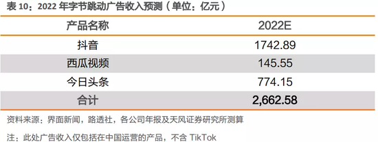 字节虽无公开数据,考虑到抖音电商业务进一步拓展到货架电商、本地生活已完成全年目标、上线对标小红书的图文窗口等,其广告营收增量不可小觑。据天风证券此前测算,2022年字节跳动广告收入(不含TikTok)或达到2662.58亿元。