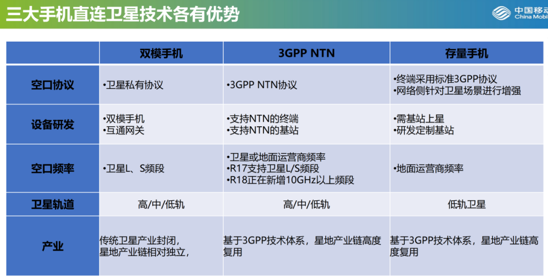 马克指出,三大手机直连卫星技术各有优势,双模手机直连卫星技术可快速落地,但产业链相对独立,技术演进缓慢;3GPP NTN技术商用进程较晚,但基于统一的3GPP协议,星地产业链复用程度高。这两种技术都支持高、中、低轨卫星。存量手机直连卫星技术采用标准4G/5G终端,无需软硬件改动,但仅支持低轨卫星,基站侧需定制增强。