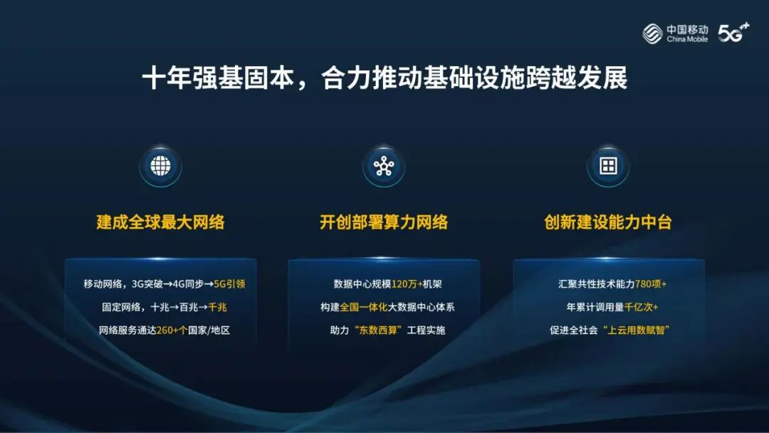 一是十年强基固本,合力推动基础设施跨越发展。畅通经济社会信息大动脉,累计完成固定资产投资近2万亿,建成全球规模最大的移动网络、光纤宽带网络。移动网络实现从3G突破到4G同步再到5G引领;固定网络实现从兆级到百兆再到千兆的跃升,网络服务通达全球260多个国家和地区。支撑构建全国一体化大数据中心体系,数据中心规模超过120标准机架,开创性部署算力网络,助力东数西算工程的实施。创新建设能力中台、人工智能、大数据等能力,年调用量超过千亿次,促进全社会“上云用数赋智”。