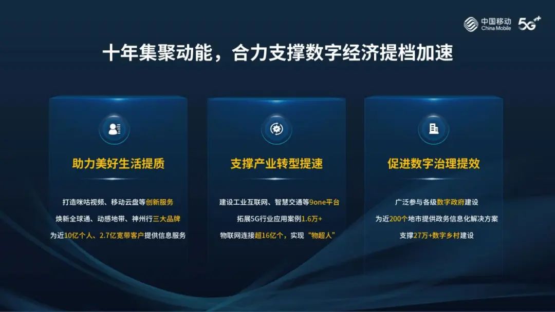 二是十年集聚动能,合力支撑数字经济提档加速。助力美好生活提质,推出咪咕视频、移动云盘等多项创新业务,换新全球通、动感地带、神州行三大品牌,为近10亿个人客户、2.7亿有线宽带客户提供优质的信息服务。支撑产业转型提速,建设工业互联网、智慧交通等9One平台,拓展5G行业应用案例超过1.6万,物联网连接总规模超过16亿,实现“物超人”。促进数字治理提效,广泛参与各级数字政府的建设,为近200个地市提供政务信息化的解决方案。