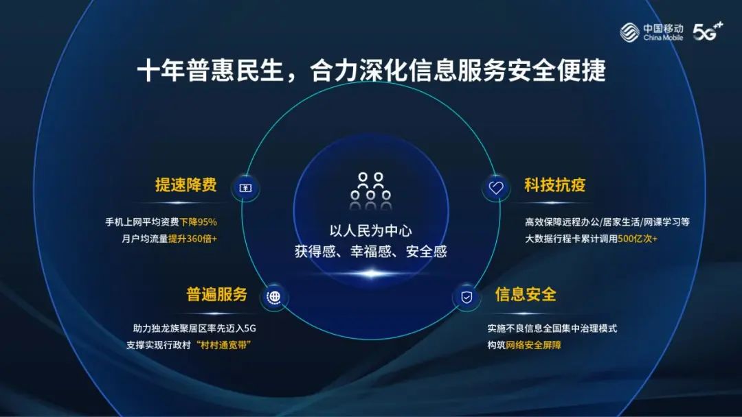 三是十年普惠民生,合力深化信息服务安全便捷。坚持以人民为中心,扎实履行社会责任,不断增强广大客户的获得感、幸福感和安全感。持续推进提速降费,手机上网平均资费下降95%,月户均流量增长360倍;弥合城乡数字鸿沟,支撑我国历史性实现行政村村村通宽带;服务国家抗疫大局,高效保障远程办公、居家生活、网课学习,大数据行程卡累计调用超过500亿次;创新实施不良信息的全国集中治理,支撑打击电信网络诈骗,构筑网络安全屏障。