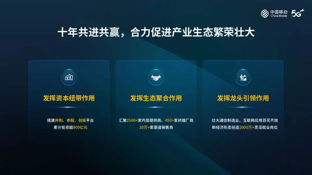 五是十年共进共赢,合力促进产业生态繁荣壮大。发挥资本纽带、生态聚合、龙头引领作用,带动产业成熟发展。发挥资本纽带作用,搭建并购、参股、创投平台,累计投资超过800亿元,收益共享、风险共担的产投协同格局逐步完善;发挥生态聚合作用,汇聚2500多家内容提供商,450多家终端厂商,30多万家渠道销售商,牵引供需两侧有效对接;发挥龙头引领作用,支撑通信制造业规模壮大,促进互联网应用百花齐放新经济形态,创造2000多万个灵活就业岗位。