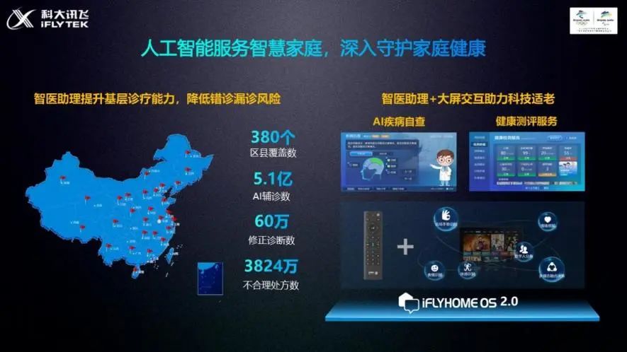 科大讯飞推动人工智能产业落地,已在教育、医疗等领域服务了海量用户。在医疗领域,科大讯飞“智医助理”可为一线医生提供AI辅助诊断建议。2017年,智医助理以456分的成绩在全球首次通过了国家临床执业医师笔试测试,超过了96.3%的人类考生,首次让机器具备了全科医生的潜质。截至目前,科大讯飞智医助理已在全国开花,共覆盖380个区域,AI辅诊5.1亿次,修正诊断数超60万次,累计识别不合理处方数3824万,AI辅助诊断准确率提升至97%,覆盖疾病数量超1400种,有效降低了错诊漏诊和用药错误风险。刘庆峰表示,目前科大讯飞也正在跟中国移动合作,将这些应用与家庭的电视大屏交互结合起来,使得老人在家里用遥控器就可以进行AI的疾病自查、健康测评服务。