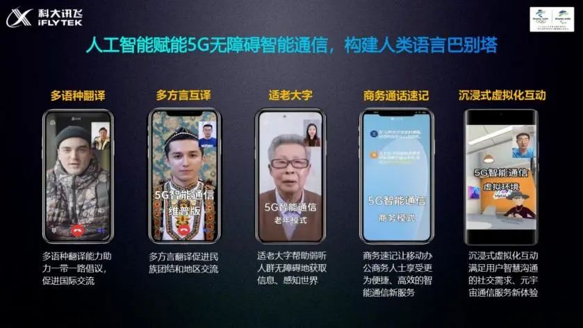 在今年的北京冬奥会上,科大讯飞成功打造了历史上首次信息沟通无障碍的奥运会,所有运动员、工作人员和志愿者都可以通过讯飞翻译机进行无障碍沟通,用讯飞听见进行会议转写和翻译。在冬奥会成功的基础上,科大讯飞与中国移动开展了5G无障碍通讯的战略合作,在软交换和底层硬件上增加了科大讯飞的翻译能力,让普通的5G手机用户,不用下载任何的软件,就可以实现实时翻译和转写服务。刘庆峰提到,在未来5年内,人类语言的巴别塔有望真正建成,无论是我们与全球沟通,还是各种方言以及少数民族语言之间的互译,以及适老化的大字显示、在商务通话中的快速记录和分享、沉浸式的虚拟化互动等等一系列AI应用,都将在不久的将来被广泛应用。