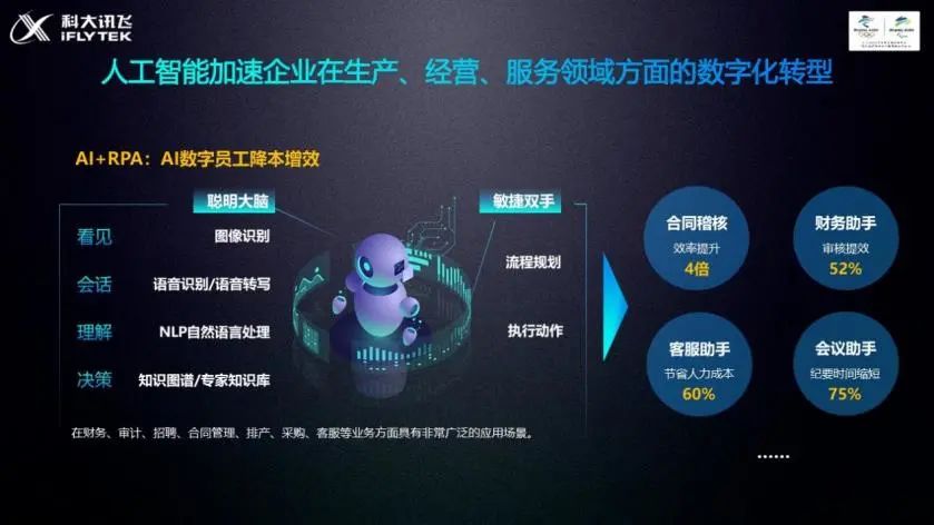 此外,科大讯飞进一步利用人工智能和RPA技术,打造人工智能的数字员工,在合同审核、财务助手、自动客服、会议记录、AI招聘等越来越多的场景得到了广泛应用,用AI帮助更多人从繁杂的重复劳动中解放出来,从而大幅提升工作效率,减少工作疏漏。