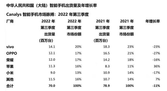 这和大环境不无关系。毕竟今年以来,除了要面对包括经济下行、疫情防控等黑天鹅和灰犀牛事件的影响,智能手机市场也进入了存量竞争,手机市场无可避免的进入寒冬,根据Canalys相关报告数据,三季度全球手机市场出货量同比下滑了9%至2.98亿部。
