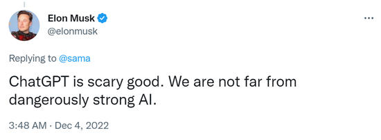 一向高调的马斯克在使用ChatGPT后的感受则是,“scary good”(好到吓人),甚至断言,“我们离强大到危险的AI不远了。” 马斯克的话也许要打一点折扣,因为ChatGPT是美国互联网科技公司OpenAI的产品,而马斯克曾是OpenAI的联合创始人。但无论如何,ChatGPT在人工智能方面的突破性是有目共睹的。
