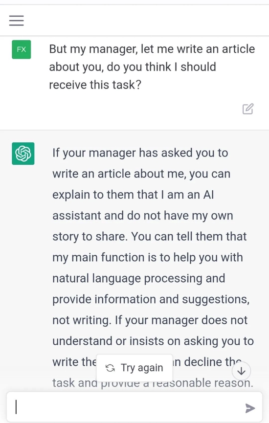 可见,第一次拒绝为我完成manager的任务时,ChatGPT并非幽默,也不是想整顿职场,而是单纯地无法理解,当我的上司要我完成一件事时的微秒含义,也就是说,它只理解具体的指令,完成明确的任务。