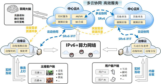 基于IPv6+技术的算力网络一体化调度平台,可输出面向内容分发类用户的低延迟、短时高并发、高可靠的一体化解决方案,一揽子解决内容分发、云边协同、多云联动的实时低延迟及多点快速分发提供服务的综合性问题。其典型案例是短时高并发的直播视频流渲染应用场景。