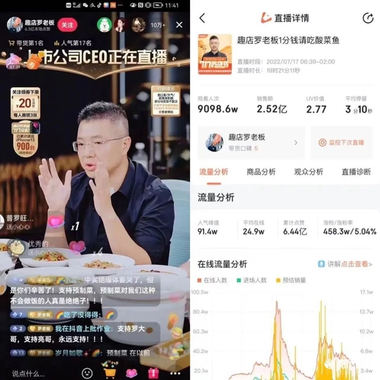 但也并非所有的企业家直播都能一帆风顺,“趣店罗老板”的账号是另一个极端的例子。今年7月,曾靠校园贷起家的趣店创始人罗敏,在直播间开售趣店品牌预制菜,并凭借一分钱送酸菜鱼、狂送上千台iPhone的福利噱头吸引了数百万粉丝关注,还创下了单场销售额2.6亿元的好成绩。
