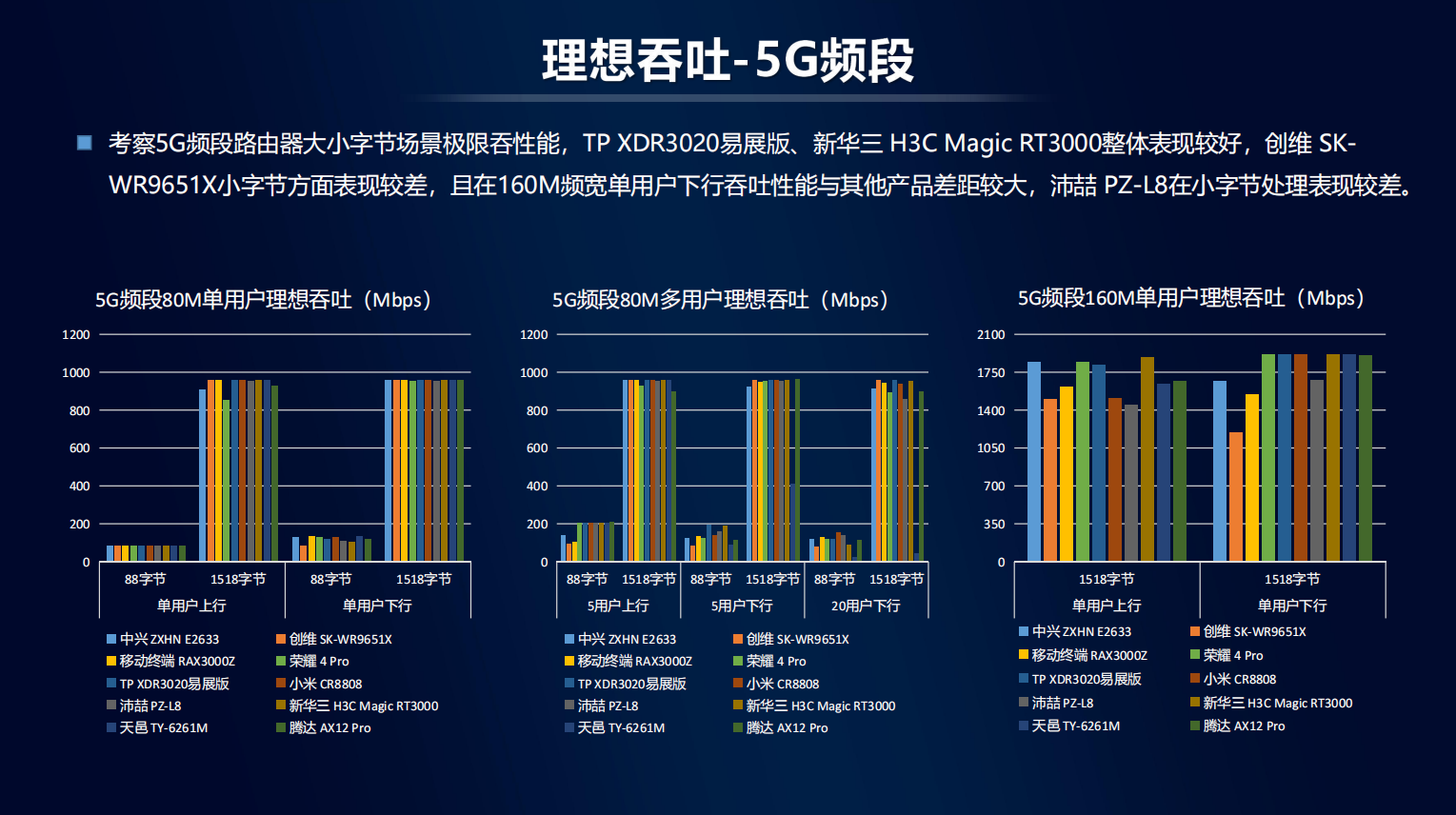 理想吞吐:考察路由器大小字节场景极限吞性能。2.4频段下,TP XDR3020易展版、新华三 H3C Magic RT3000整体表现较好,创维 SK-WR9651X在大字节方面表现较好。5G频段下,TP XDR3020易展版、新华三H3C Magic RT3000整体表现较好。
