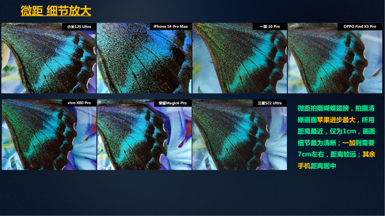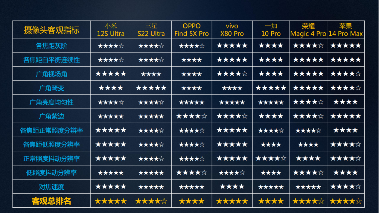 本次评测集合小米12S Ultra、iPhone 14 Pro Max、三星S22 Ultra、vivo X80 Pro、荣耀Magic Pro、OPPO Find X5 Pro、一加10 Pro七大主角,围绕“客观指标”+“主观场景 ”两大体系,涉及灰阶、对焦速度、边缘畸变、亮度均匀性、白平衡连续、视场角、各焦段分辨率、紫边八大维度50个分项,基于顺光、夜景、逆光三大要素的90个主观场景,通过800张照片、600条视频进行多维度、全方位的严格测试,最终得出可专业的评测结果。