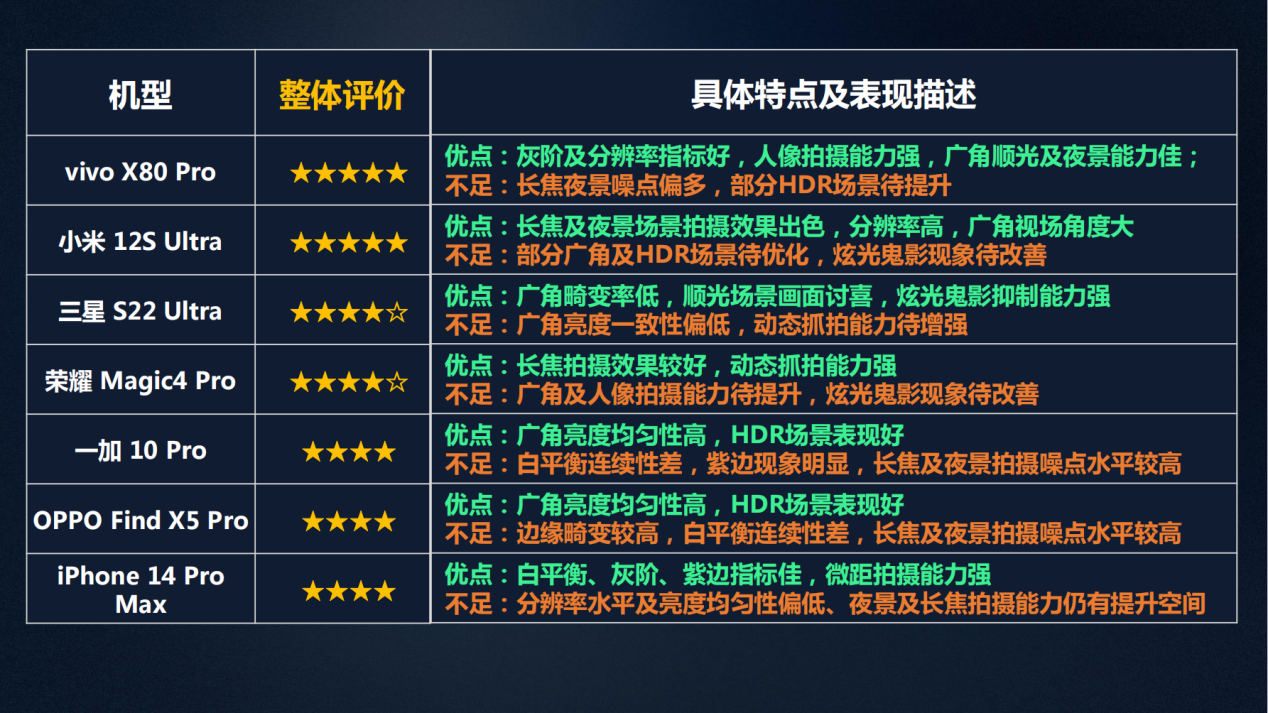 在主观场景测评中,凭借出色的夜景场景拍摄、高分辨率,小米12S Ultra和vivo X80 Pro再次领跑,并列综合表现榜单之首。从整体情况来看,小米12S Ultra长焦效果好、广角视场角度大;vivo X80 Pro灰阶指标好、人像拍摄能力强。