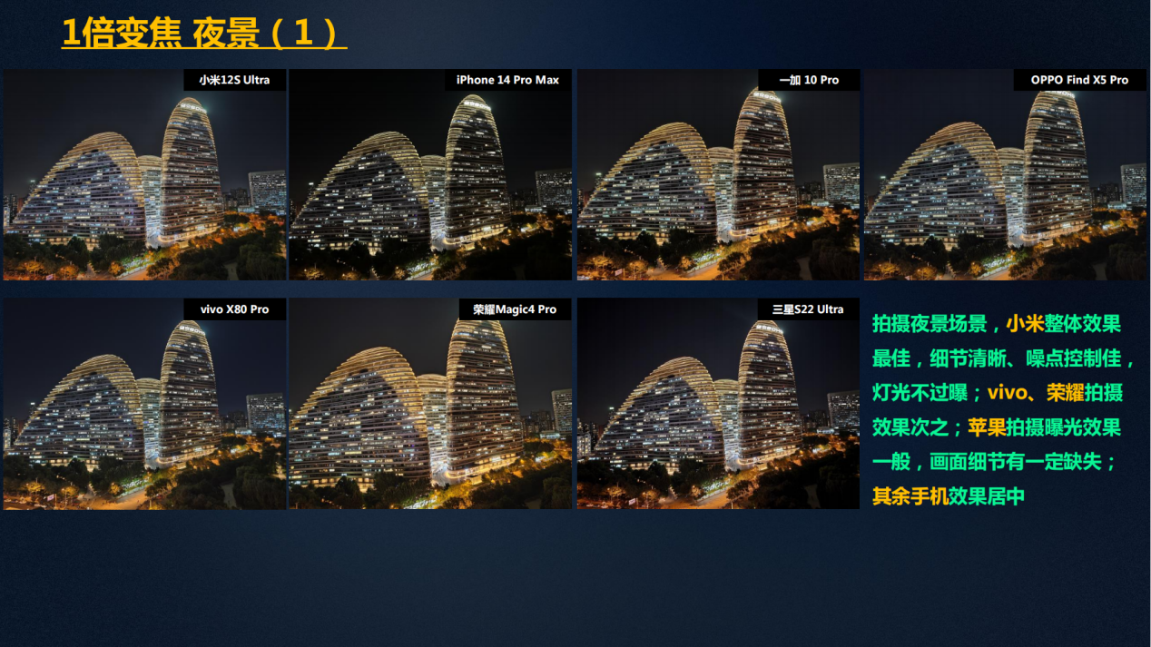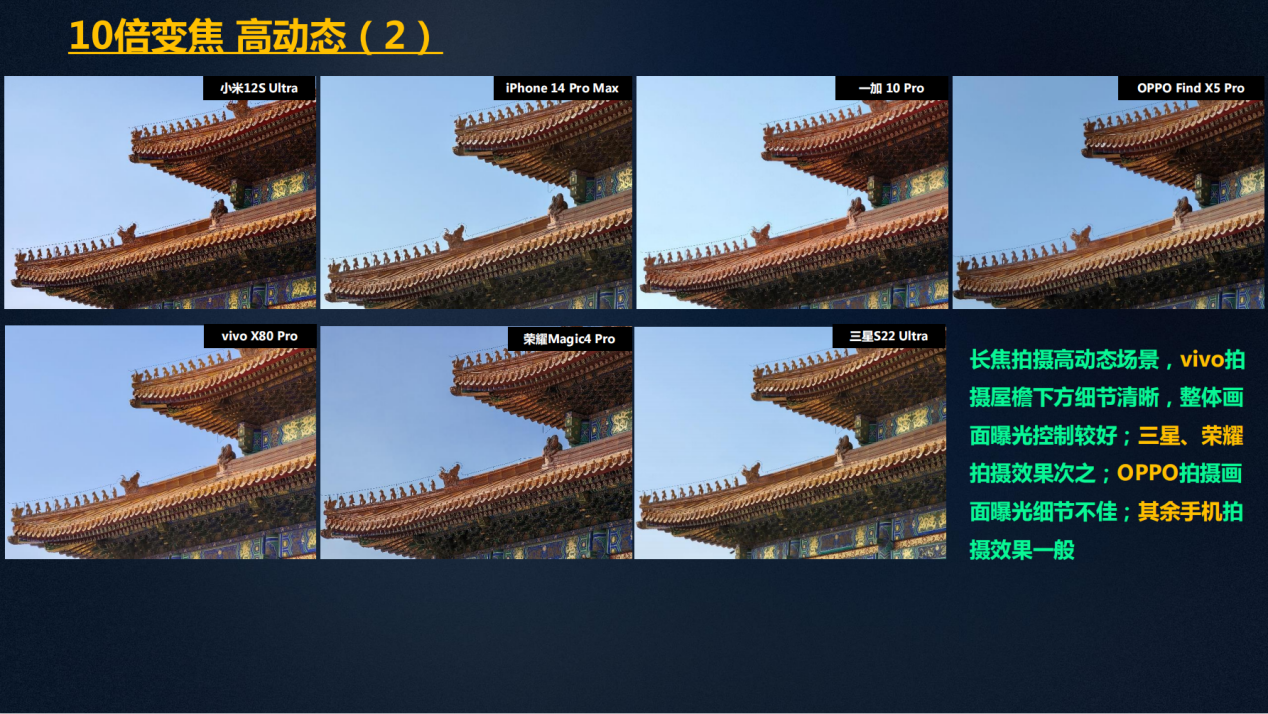 10倍变焦顺光场景下,vivo、小米、荣耀、三星拍摄效果最佳,清晰度高,曝光适度、画面讨喜;HDR场景下,vivo细节清晰,整体画面曝光控制较好;夜景场景下,小米对拍摄景物的灯光细节呈现清晰,灯光光晕不明显,噪点控制佳。