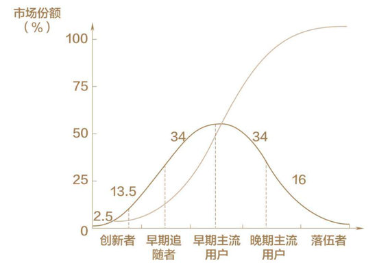 如下图所示,“创新者”人数最少,大概占到总市场的2.5%,但他们是新产品的最先购买者和试用者,对主流市场具有显著的引领作用。早期追随者大约为13.5%,早期和晚期主流用户大约分别占34%,落伍者占据16%。