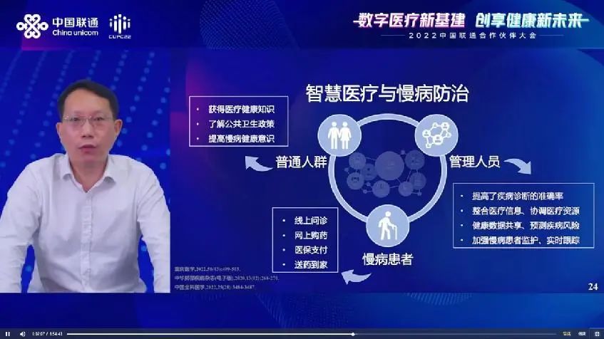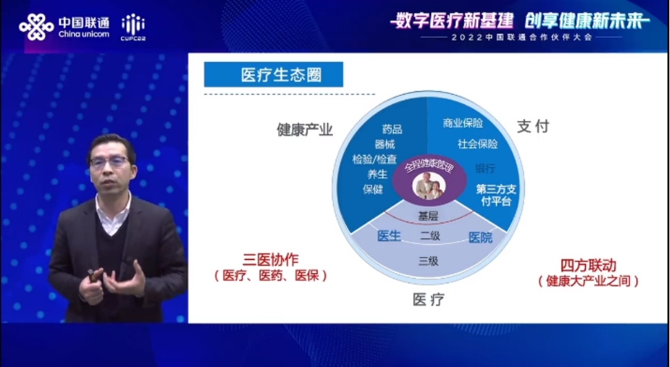 2022年12月20日下午,2022中国联通合作伙伴大会智慧医疗分论坛线上举行。论坛以 “数字医疗新基建,创享健康新未来”为主题,共话新技术与数字健康深度融合发展,共享5G技术、互联网+、大数据、人工智能等新技术在数字健康领域的创新成果。中国联通副总经理梁宝俊、国家卫生健康委医院管理研究所副所长张旭东等领导及医疗行业权威出席论坛。