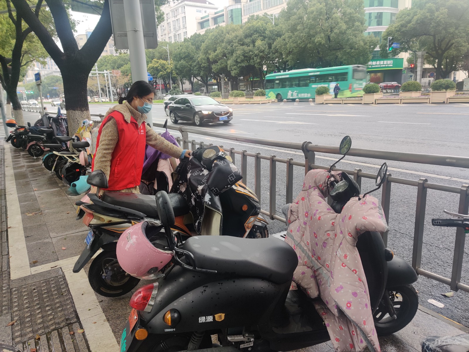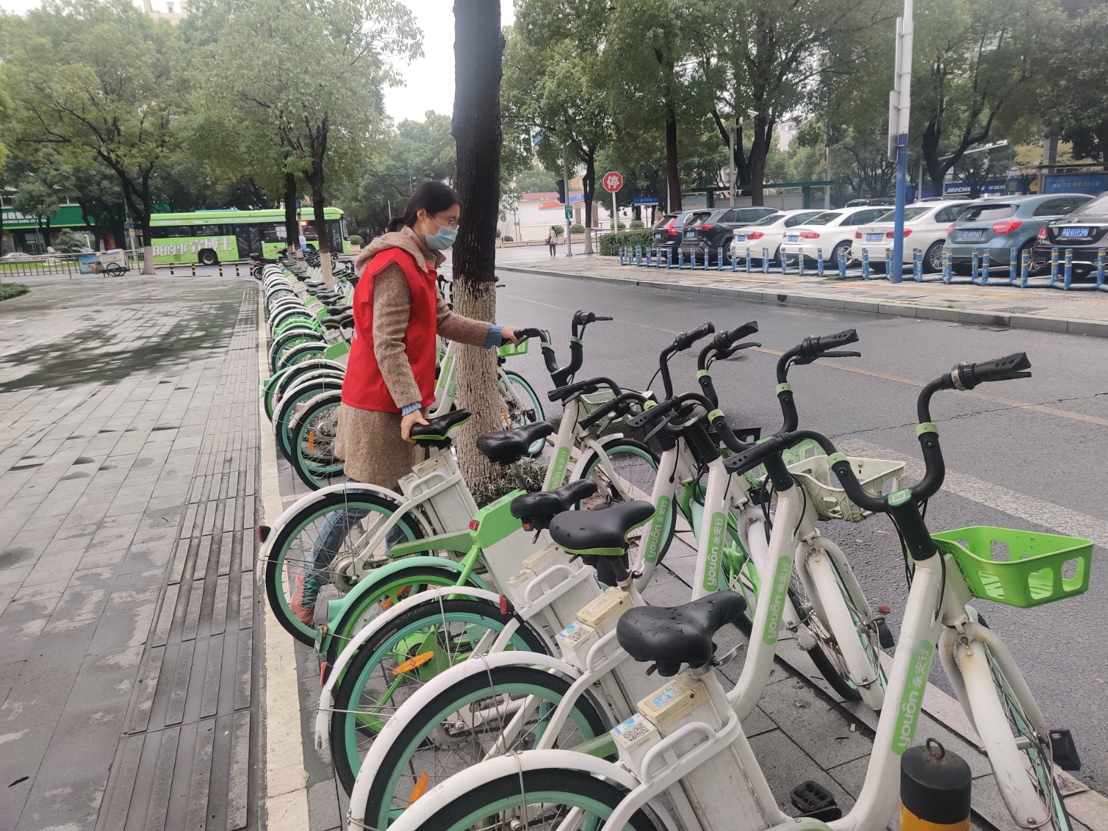 另一支小队在路边的非机动车停靠点忙碌着,她们把随意停放的电瓶车推到指定区域,按照统一方向摆放整齐,把“摔倒”在地的自行车扶起来停稳放好,让原本杂乱停放的车辆变成整齐的风景线,不仅优化了市容环境,也消除了市民出行隐患。