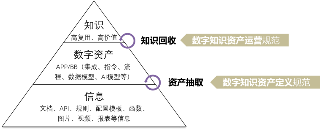 数字知识资产定义规范和运营规范分别作用于资产抽取和知识回收两个阶段。资产抽取:从文档、API、规则、配置模板等各种格式的载体中抽取有用信息,并且进行数字化、标准化成为数字资产的过程;知识回收:通过资产价值评估等运营手段识别出来优质的、高价值的资产,并沉淀为知识的过程。规范的整体发布范围如下表所示: