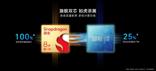 性能方面,荣耀80 GT采用4nm制程工艺的高通骁龙8+旗舰芯片,相比上一代,CPU性能提升了10%,CPU和GPU功耗分别下降30%,荣耀的底层优化可充分释放骁龙8+的强大性能。除“主芯”外,荣耀80 GT还搭载了一颗大幅提升电竞体验和视频体验的超帧独显芯片。相比单芯片,旗舰双芯让荣耀80 GT游戏帧率最高提升100%,游戏功耗最高下降25%,为手机的游戏体验提供了良好的硬件基础。