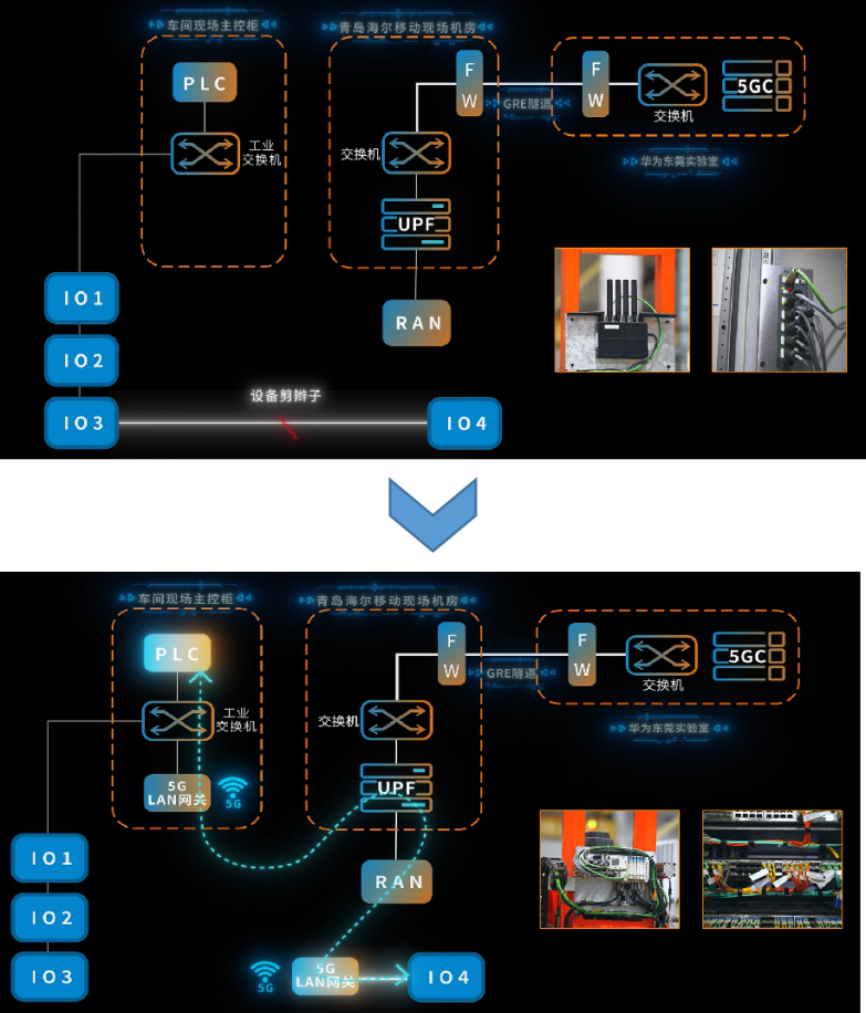 5G-LAN技术,通过二层组网、组播通信和PRP冗余传输机制,可以原生的承载海尔工厂拖链电缆的Profinet协议,避免主、从PLC之间通过增加额外隧道或者配置其他设备实现互通,减少实施复杂度,实现主控柜中主PLC和从PLC之间的直接数据通信。