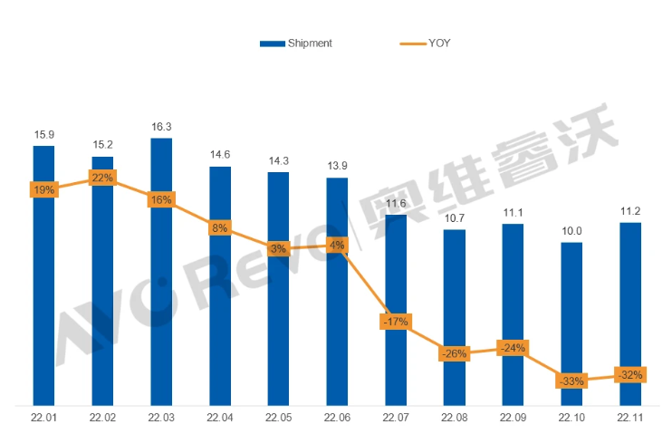 但根据奥维睿沃的数据统计,2022年11月显示器面板出货11.2M,同比下降32%,环比增加12%,环比虽呈现回升的趋势,但从相关统计图中可以看到,面板出货量几乎全年都处于下滑状态,哪怕相关售价下降后也难以扭转低迷的市场需求。