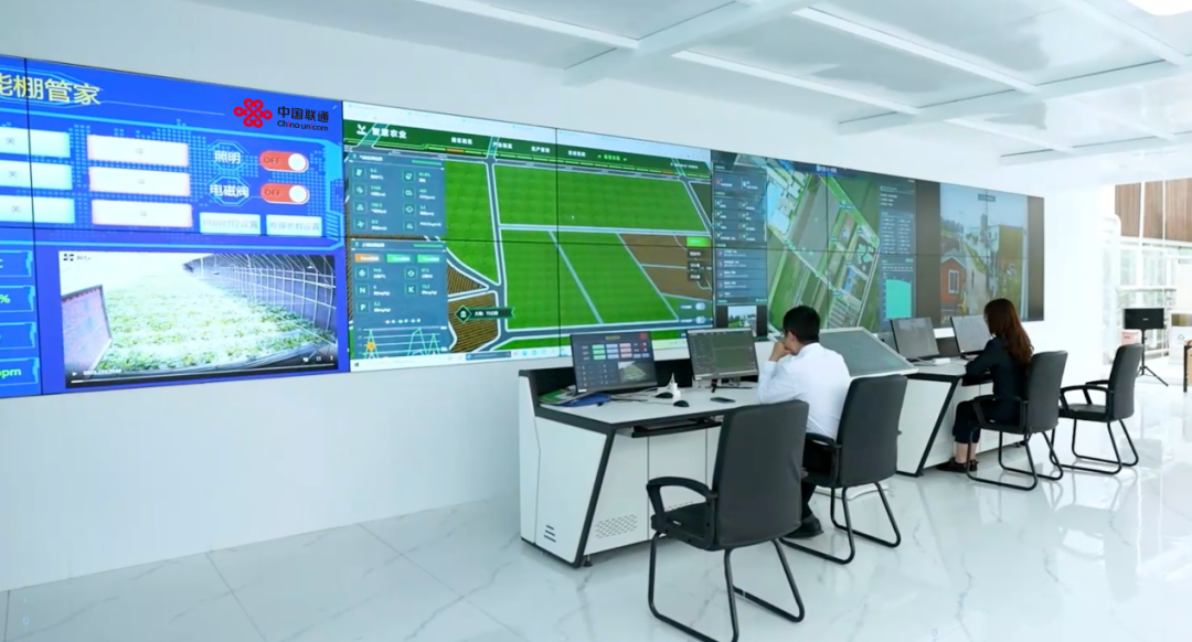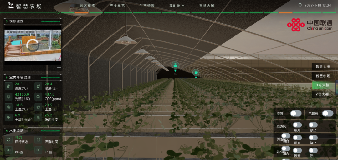 通过5G网络、云专线等传输线路,云端数据平台与各个监测设备进行数据连接,形成一个软件+硬件的智慧农场应用平台,达到数据资源整合、AI应用落地的效果——这是中国联通为同福农场搭建的大数据平台,大棚内空气温湿度、光照强度、氧气浓度、土壤温湿度等指标一目了然,种植人员可以实时查看大棚各种设备的监测情况,并且进行预警分析。