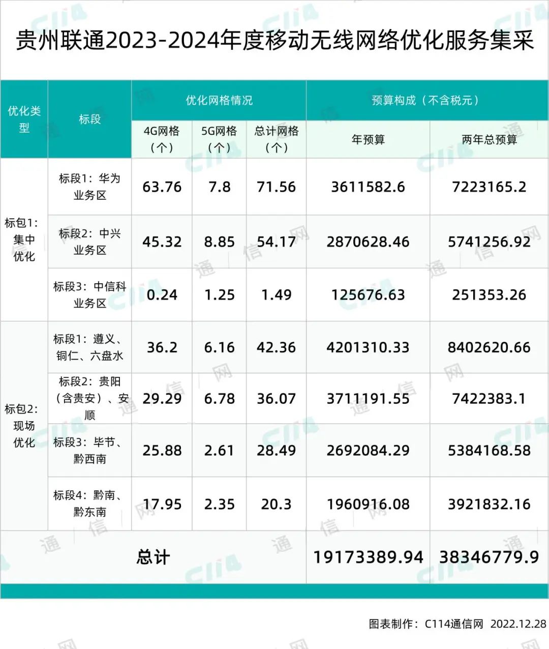 C114讯 12月28日消息(焦焦)从中国联通官网获悉,贵州联通日前公示了2023-2024年度移动无线网络优化服务的集采结果,华为、中兴、大唐等7家入围。