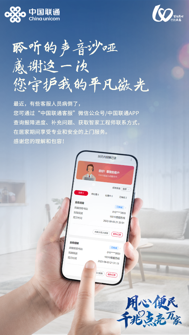 中国联通坚持以百倍用心换用户十分满意,用高品质通信服务增强人民群众获得感、幸福感、安全感。