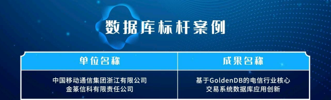 由中国移动通信集团浙江有限公司和金篆信科有限责任公司联合申报的“基于GoldenDB的电信行业的核心交易系统数据库应用创新”案例荣获“数据库标杆案例”。