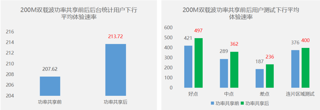 湖南电信在长沙现场部署200M双载波动态功率共享后,相比功率静态配置,现场定点测试用户下行平均体验速率在好、中、差点均有约20%提升,连片区域内车载测试用户下行平均体验速率提升约6%;部署5G站点平均用户感知速率提升约3%,流量同步提升约3%。