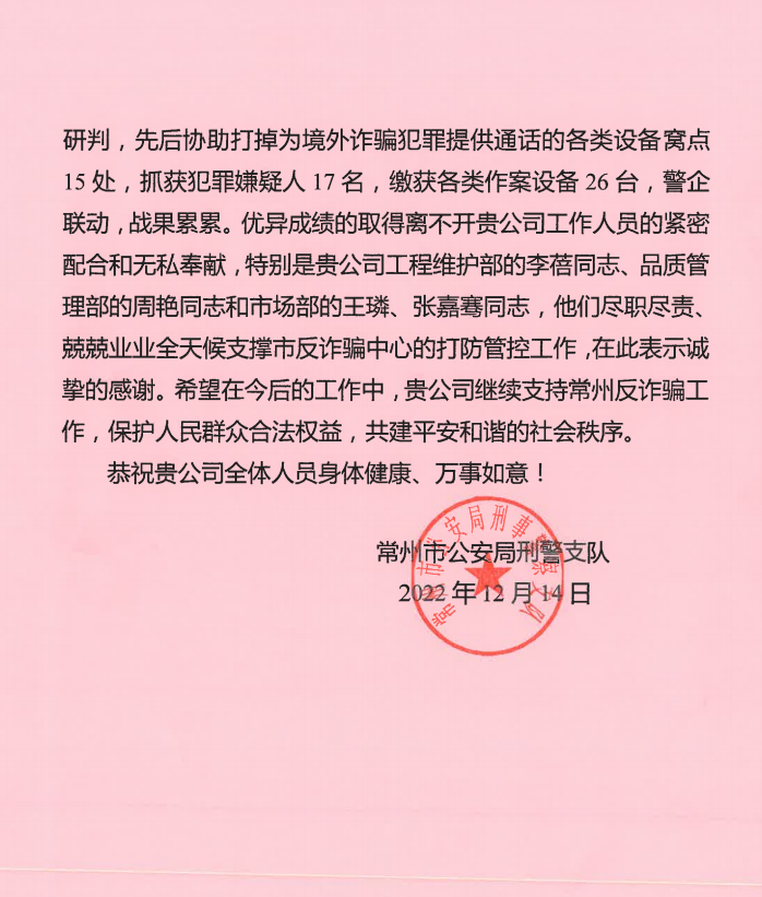 近日,常州移动收到了来自常州市公安局刑警支队的感谢函。在感谢函中,常州市公安局刑警支队对常州移动紧密配合、尽职尽责支撑市反诈骗中心打防管控工作表示了诚挚的感谢,并对常州移动相关工作人员兢兢业业、无私奉献的职业精神给予了高度肯定。