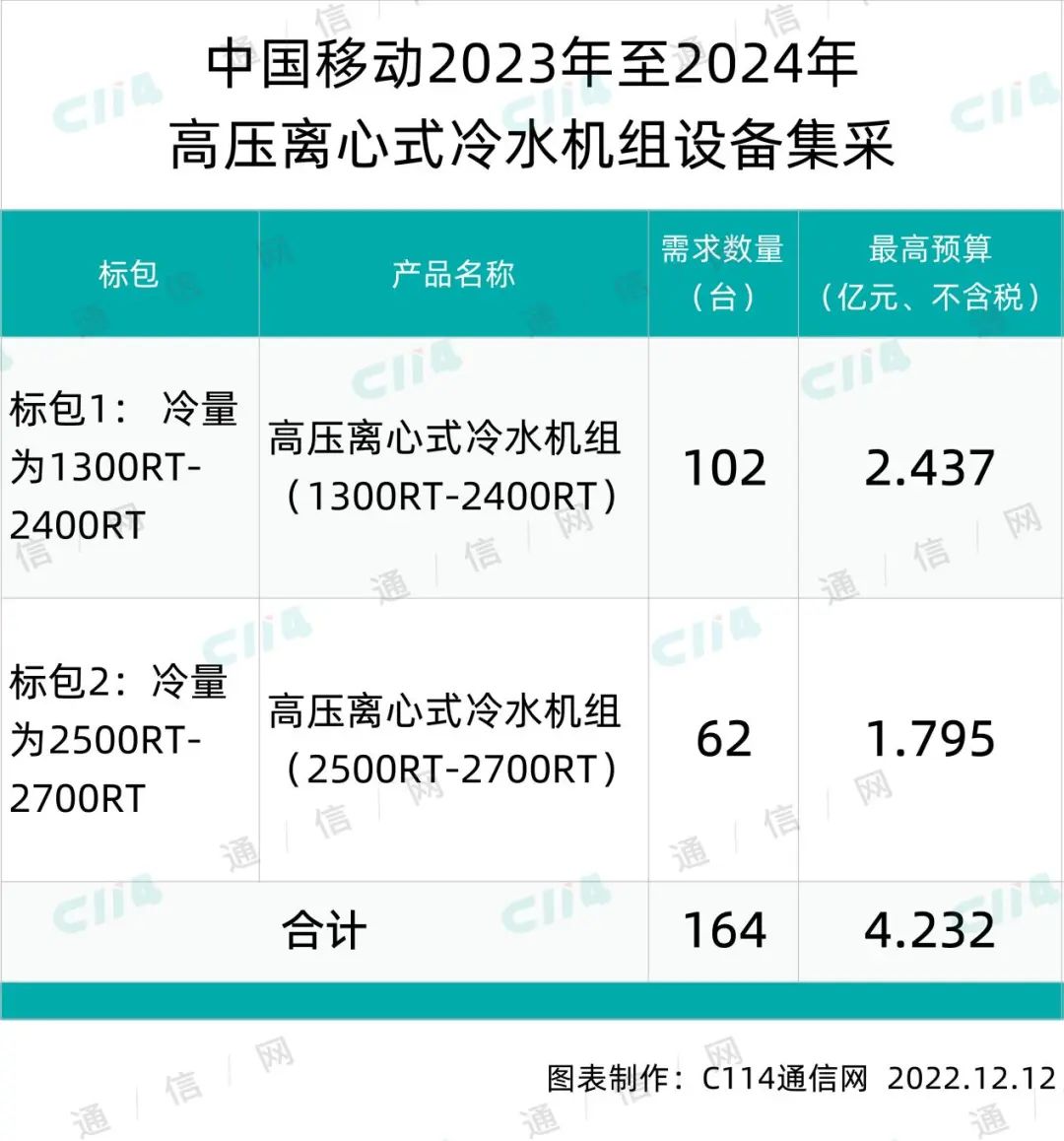 据此前中国移动发布的采购公告显示,本次采购的高压离心式冷水机组设备,按制冷量分为1300/1400/1500/1600/1700/1800/1900/2000/2100/2200/2300/2400/2500/2600/2700 (RT),共计15个型号,采购规模合计164台高压离心式冷水机组。项目最高总预算4.232亿元(不含税)。
