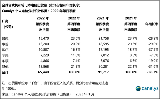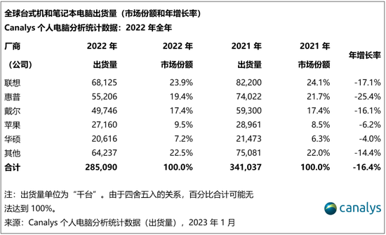 2022年全球个人电脑出货量下降16%,跌至2.85亿台