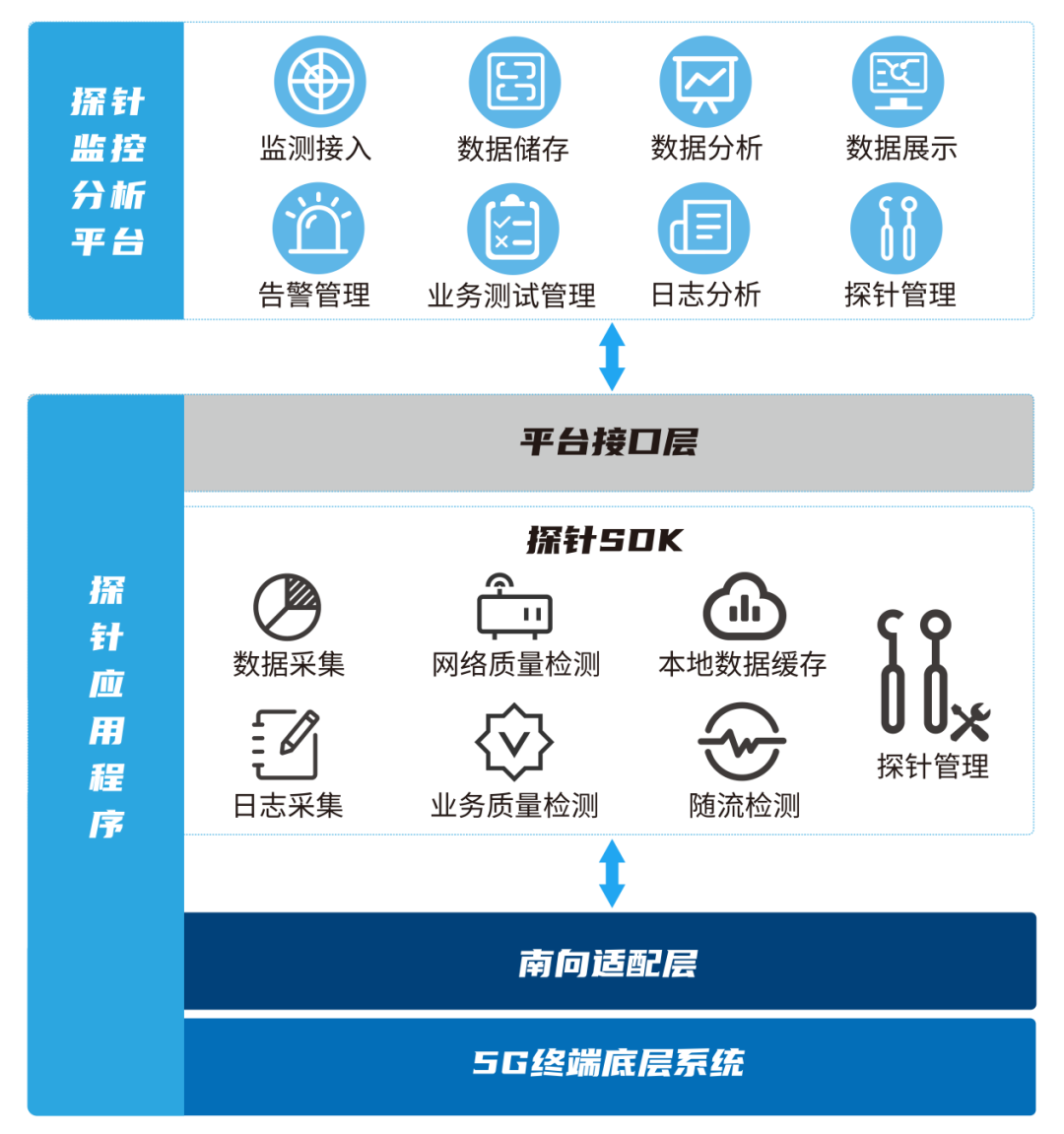 基于探针SDK的探针应用程序拥有南北双向接口,北向接口对接探针监测分析平台,向平台上报采集的数据、事件、日志等数据,接收平台下发的探针配置和管理指令、业务测试任务;南向接口,对接5G网络终端设备底层网络及底层操作系统,采集终端设备及下挂设备的基础信息、性能数据、网络数据等。
