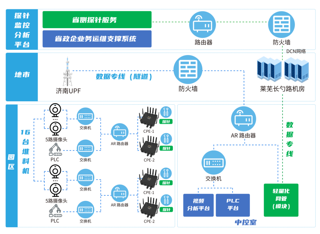 采取园区轻量化网管部署方式将数据回传至省政企业务运维支撑系统,实现四信5G工业CPE F-NR200探针数据与山东省5G专网运维平台对接;通过构筑稳定高效的5G网络,钢厂料场区实现高清视频回传、PLC远程控制信令下发和3D扫描仪数据回传等,大幅提升企业运维效率。