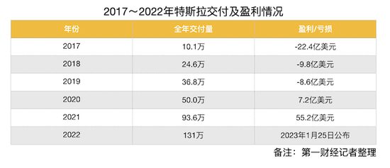 2017~2022年特斯拉交付及盈利情况(图源:第一财经记者整理自财报)