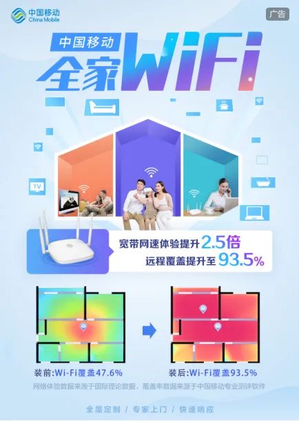 中国移动全家WiFi是面向中国移动家庭宽带用户提供的一项智慧家庭网络优化服务,包括专业的家庭Wi-Fi环境测评、组网方案设计、专业终端适配、调测部署服务,以达到Wi-Fi覆盖更优、上网更稳更快的目的。“Wi-Fi广覆盖,上网稳又快”是中国移动希望给每一位用户带来的体验。