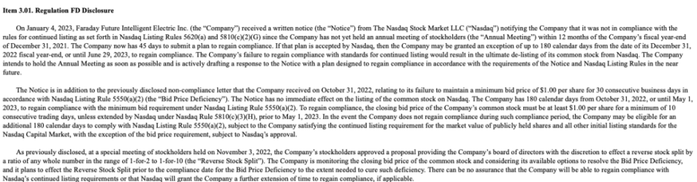 事实上,在此之前,FF于2022年10月31日就已收到纳斯达克发出的违规函件。该函件涉及FF未能按照纳斯达克上市规则的连续30个工作日保持每股1美元的最低出价(“出价不足”)。为了重新合规,FF普通股的收盘价必须在至少连续10个交易日内为每股1美元。纳斯达克方面明确,FF公司有180天(即2022年10月31日~2023年5月1日)的时间来重新合规。