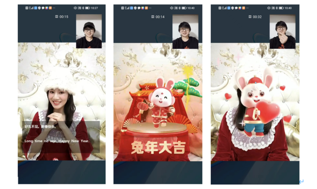 谁不想成为拜年风潮里的时髦玩家?!那就让智能应用来丰富你的社交人设,连接情感:视频通话过程中,你可以使用虚拟背景、虚拟头像、语音表情雨、手势动效等个性化体验。试试看对着视频那端的亲友说“恭喜发财”、“新年快乐”、“兔年大吉”,或做出“比心手势”、“点赞手势”会有意想不到的惊喜哦~