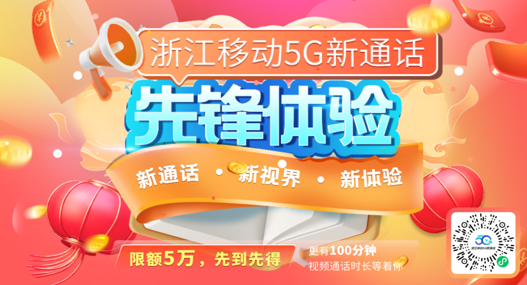 心动了吗?浙江移动为让更多用户尝鲜,本次活动共释放5万个“先锋体验用户”名额,不仅能限时免费体验5G新通话,还有100分钟视频通话时长等你领取!