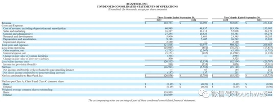 财报显示,BuzzFeed在2022年前9个月营收3.03亿美元,较上年同期的2.52亿美元增长20%;净亏损为9514万美元,上年同期的净亏损为1570万美元;其中,BuzzFeed在2022年第三季度营收为1.04亿美元,较上年同期的9001万美元增长16%;净亏损为2699万美元,上年同期的净亏损为358万美元。