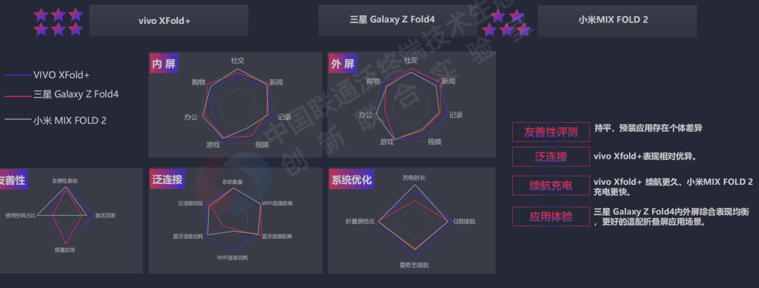 评测结果显示,这三款折叠手机友善性评测持平,预装应用存在个体差异;泛连接能力评测vivo Xfold+表现相对优异;续航充电方面vivo Xfold+ 续航更久、小米MIX FOLD 2充电更快;应用体验方面三星 Galaxy Z Fold4内外屏综合表现均衡,更好的适配折叠屏应用场景。