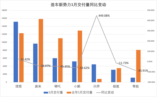 对于今年1月份车市表现不佳,市场早有预期,不过几家销量低的交付数据还是令不少业内人士大跌眼镜。在被统计的几家新势力中,仅有理想和AITO问界实现了同比的交付量增长,但问界的同比增长其实只是建立在其交付初期的低基数基础之上。零跑汽车1月交付量较去年同期下滑最为严重,降幅达到了85.91%。